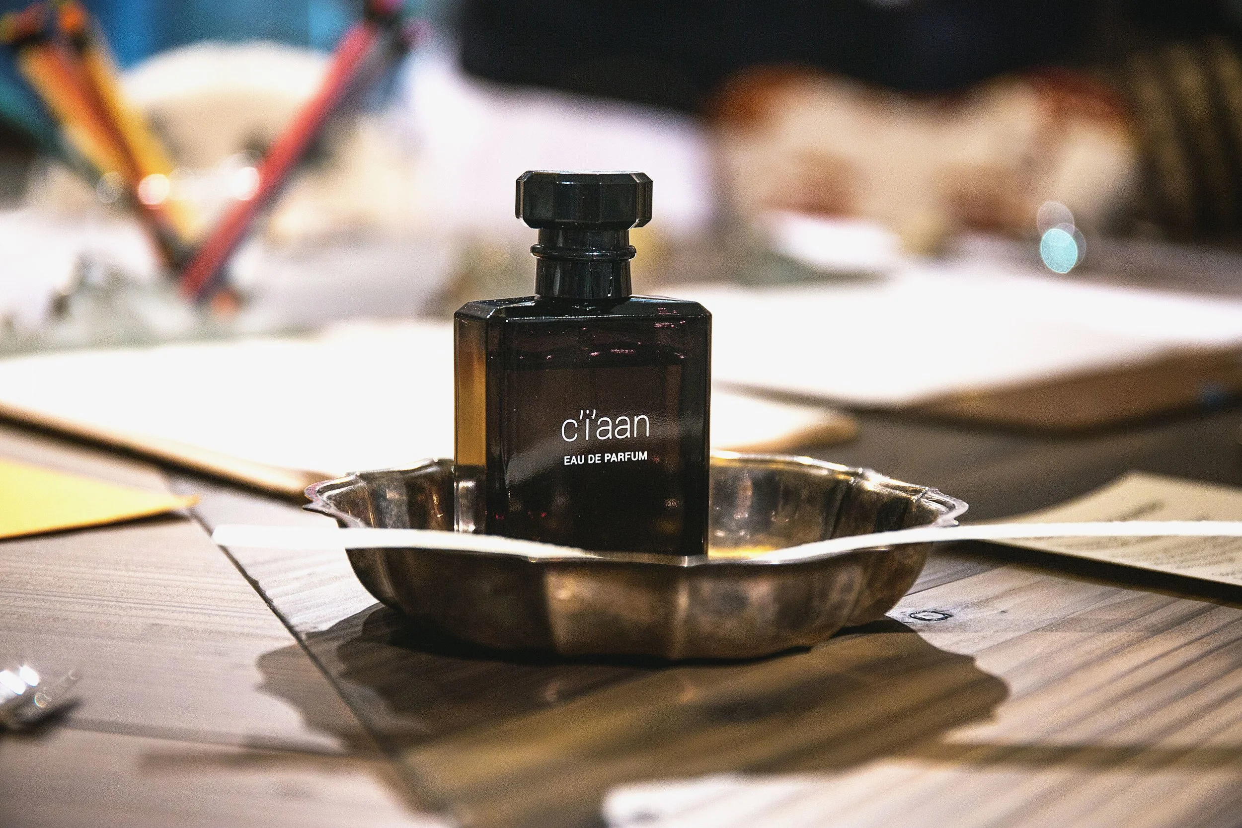 The citrus and resinous quality of Mezcal Blanca by Kelly + Jones paired exquisitely with MJ Tyson’s presentation of vintage boxes, stories, and a tray of metal jewelry, scented with a metallic accord. Lynn Batchelder’s scratched photographs, graver tools and metal chips continues the metallic theme. Paired with the energetic Flashback in New York by Olfactive Studio, Tuscan leather lends warmth to her final course, a scratched metal necklace.