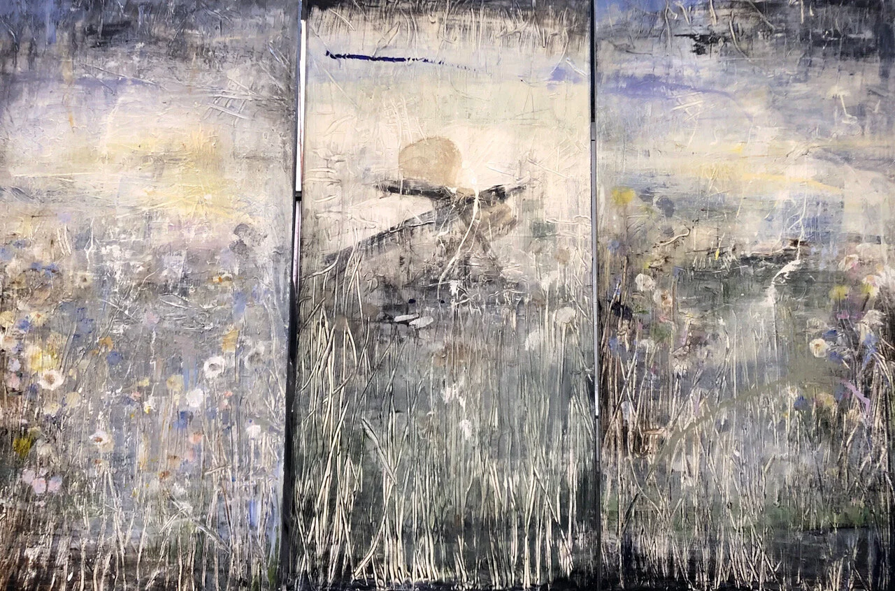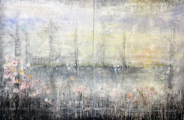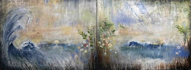 Original Art by NYC Artist Susan Woldman Elfer. Windmills Diptych, two panels each measuring 48” x 36”, total size 48” x 72”.