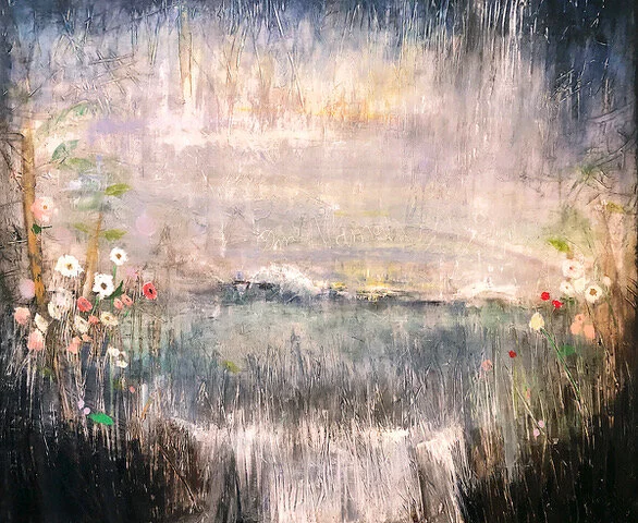 Original Art by NYC artist Susan Woldman Elfer, Red Flowers And Boat measures 6ft x 4ft